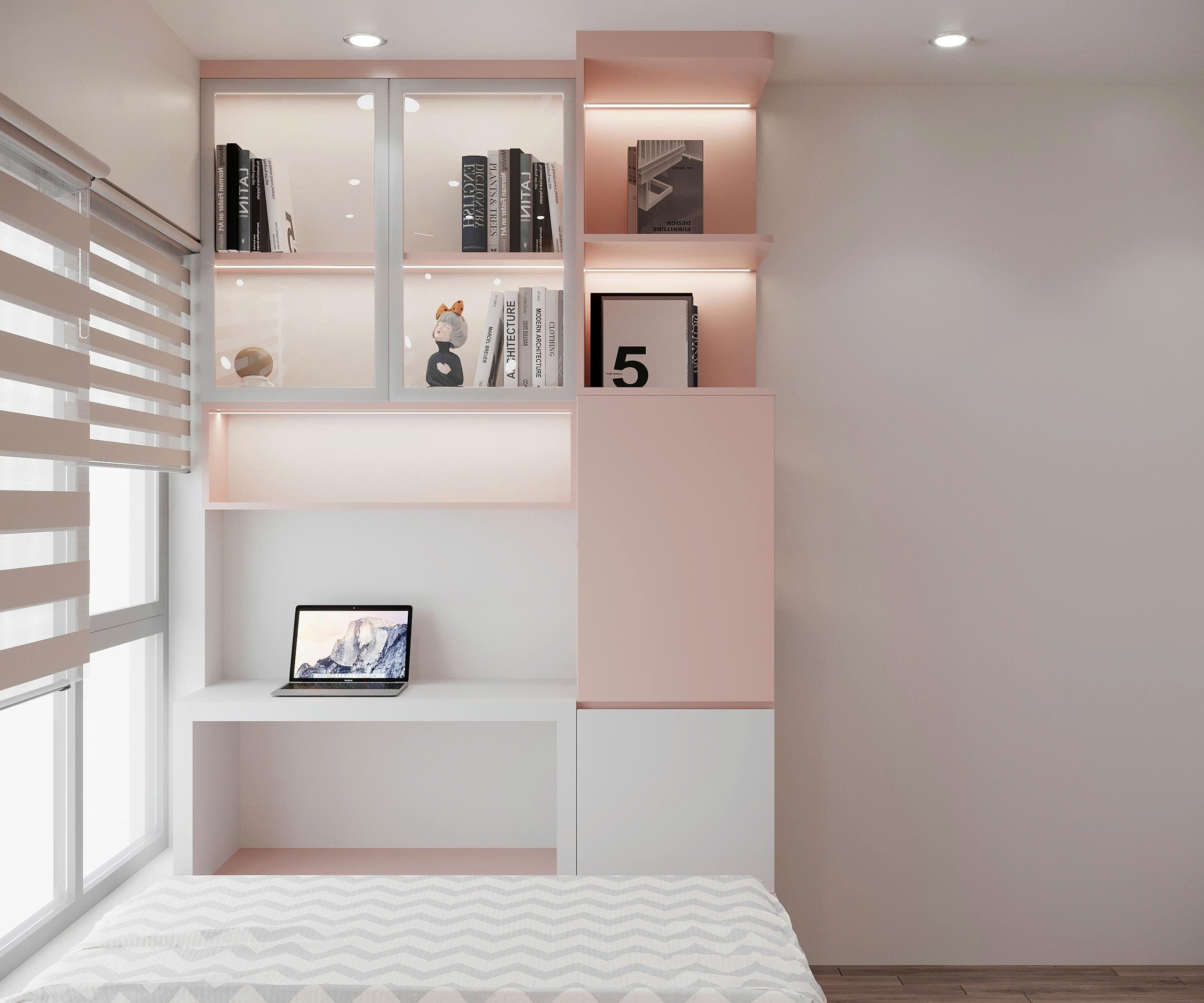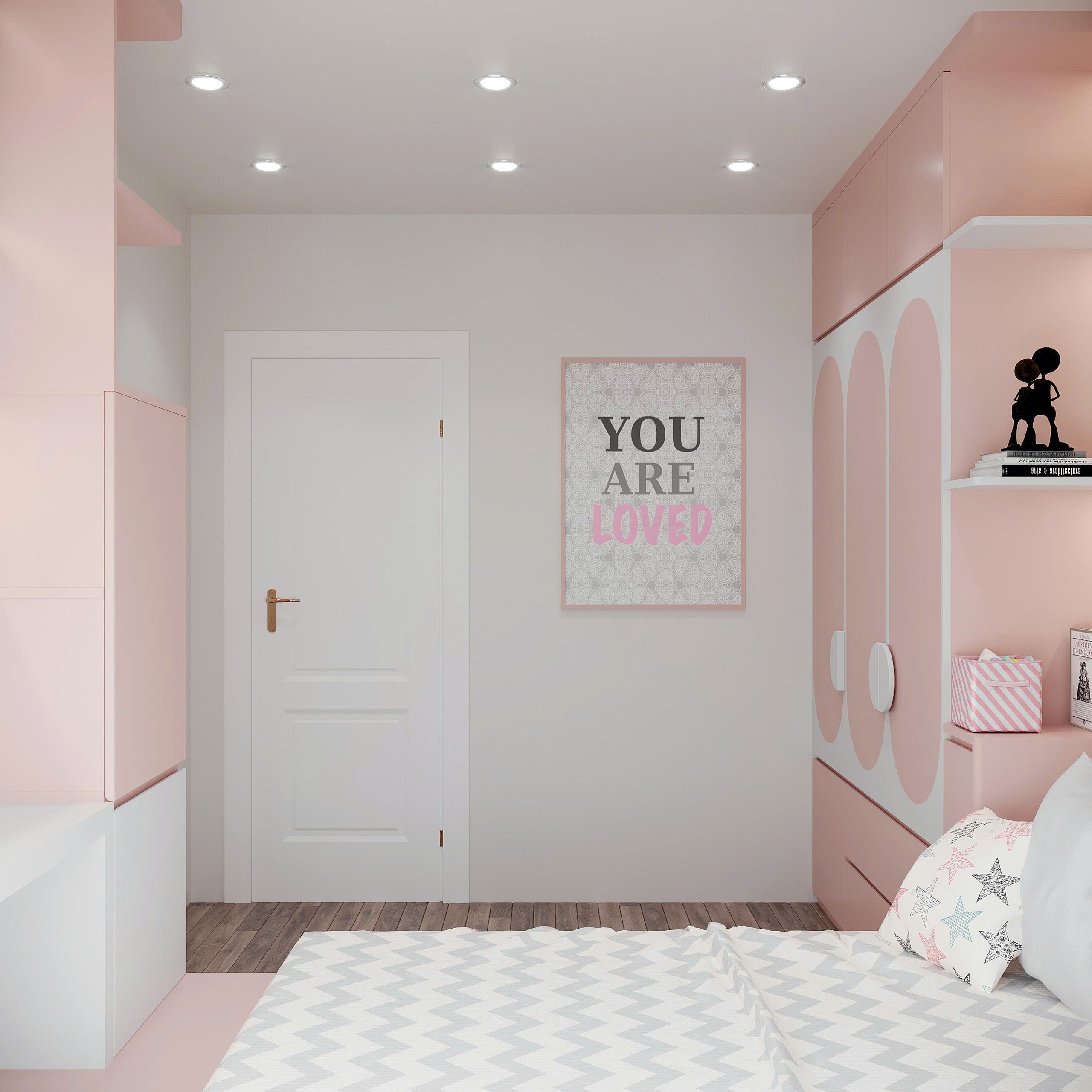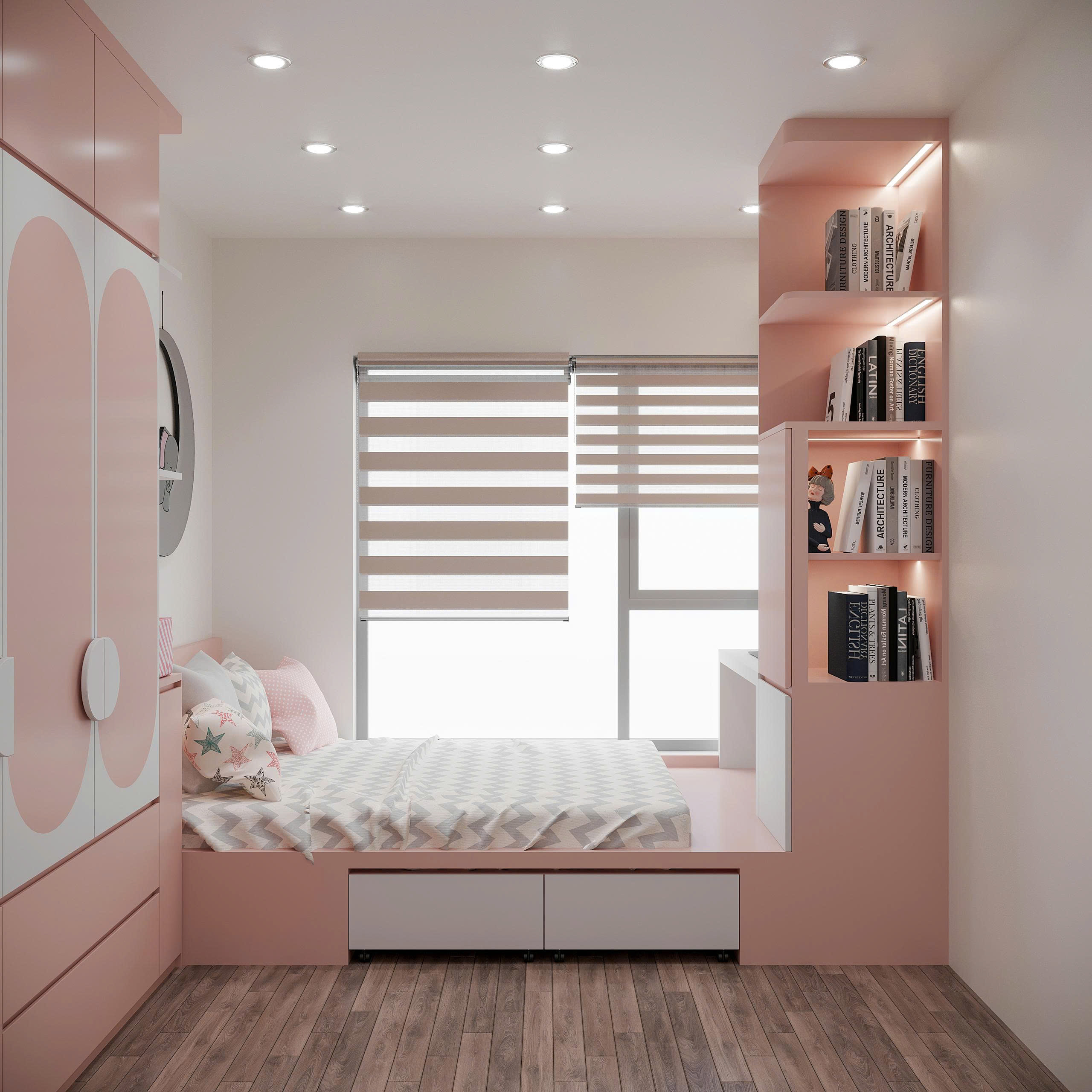 Thiết kế phòng ngủ bé gái với tone màu hồng nhẹ nhàng, phối kết hợp với tone trắng, tạo lên sự hài hoà, tối ưu hoá không gian nhất, khiến bé yêu nhà bạn mê mẩn luôn.